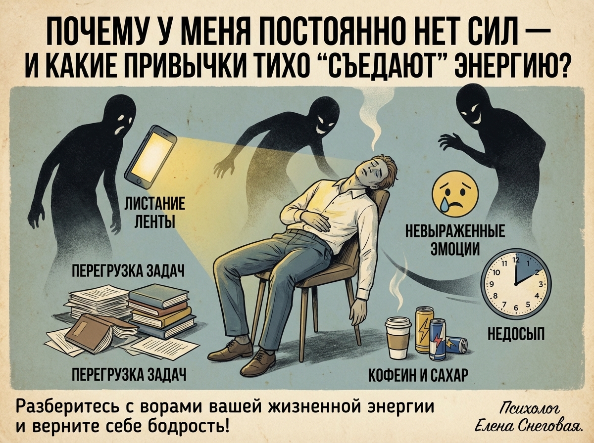 Состояние «нет сил» не всегда связано с ленью или слабой волей. Часто энергия уходит через привычки, которые выглядят “обычно” — но ежедневно перегружают нервную систему и тело.